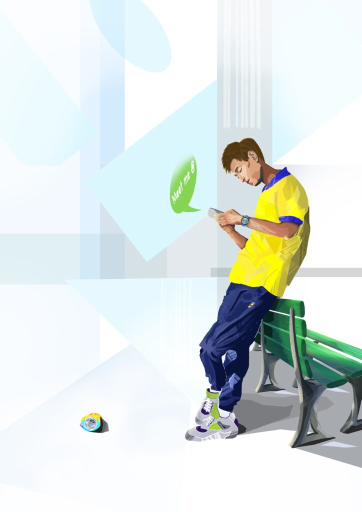 Created using Procreate on an Apple iPad Air. This artwork is continuing the theme of my previous artworks of ‘Texting Dude’ but here I have introduced Skateboard Sally. These artworks are inspired by the artist Michal Sawtyruk.