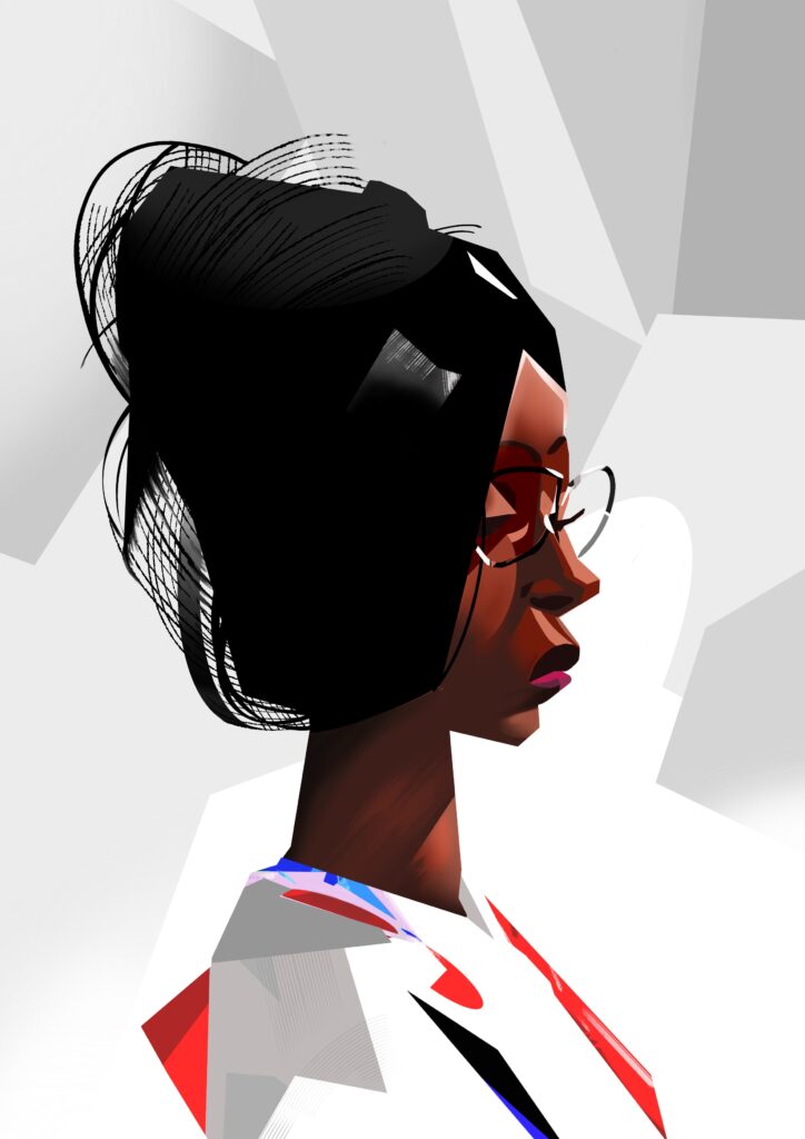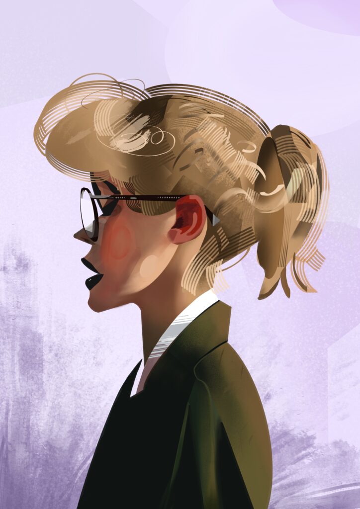 Created using Procreate on an Apple iPad Air. For this piece I used mainly brushes from Claudia Riveros. They were the ‘Portrait’ set and the ‘Feels like pencil’ set. The hair was not as intended though. I tried to do wavy premed hair but found it too difficult, so ended up with wavey straight hair.