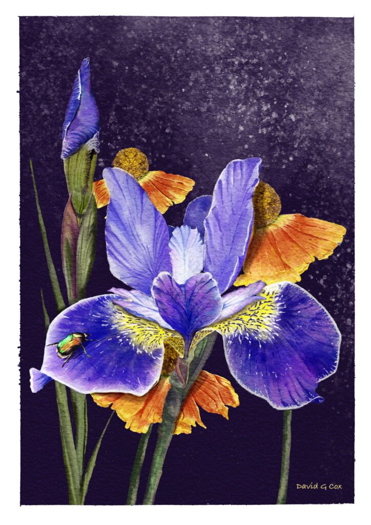 Created using Procreate on an Apple iPad Air. This digital watercolour was painted from a reference photo taken in my garden when the Irises this year were in spectacular bloom. I added the Helleniums in the background purely as a contrasting colour, they don’t actually flower at the same time. The Iris variety is called ‘Silver edge’.
